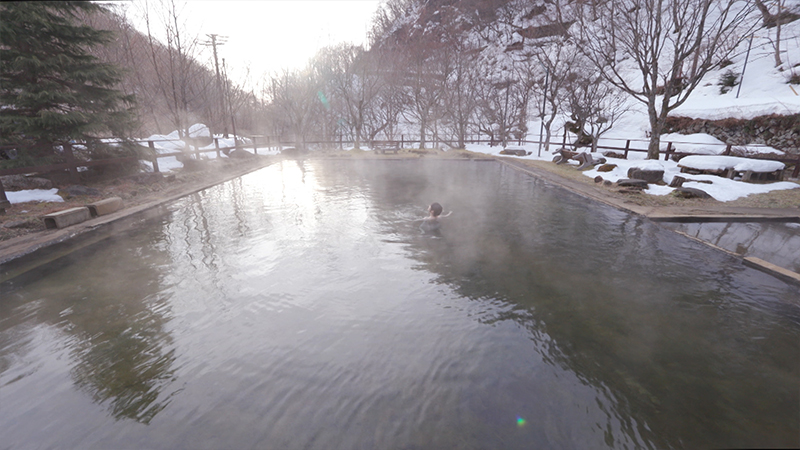 旅館の建物前に広がるのは「温泉プール」。幅10メートル、長さ15メートルの巨大な湯船です。湯量豊富だからこそ成せる、開放感抜群のお風呂です。