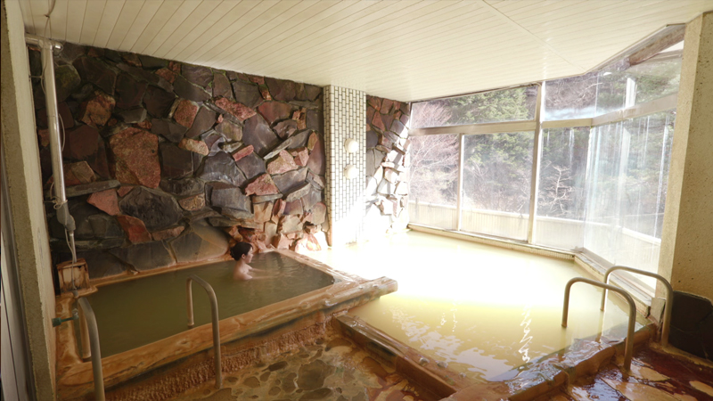 甲府市街地から、車でおよそ1時間。標高1000mの、増富温泉。湯治場として知られる温泉です。津金楼は最も古い歴史を持つ宿。創業は明治時代。男女別の大浴場があり、浴槽が2つに分けられています。広い湯舟は28度の源泉が張られた温湯、小さい湯舟には41度に加温されたお湯です。塩分や鉄分のほか、放射性物質のラジウムを含んだ珍しいお湯です。木製の湯舟の淵を覆い隠すように温泉成分が固まっており、昔からこの成分豊富なお湯を求めて、湯治客が絶えないそうです。その他貸切風呂もあります。夕食は鯉の洗いなど素朴で気取らない食事です。