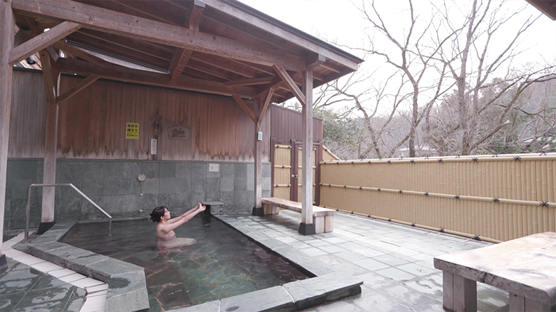 日帰り温泉・四季彩館から車で15分。静かな山の中に入浴施設・とき川があります。日帰りだけの入浴施設です。部屋は2部屋のみ。それぞれに貸し切りのお風呂と食事が付いています。滞在できるのは、昼の部と夜の部で4時間ずつ。お風呂は内風呂だけ。大人二人でゆったりとくつろげる広さです。入浴してまず感じるのが、強いぬめり。ここのお湯は、PHが11.3もあり、日本でも屈指の強アルカリ性のお湯です。ヌルヌルすべすべの感触で41度ほどのちょうどいい湯加減です。とき川の食事は、前菜から、煮物、焼き物などが揃う懐石料理。宿の周辺にはユズが自生していて、料理にも使われています。