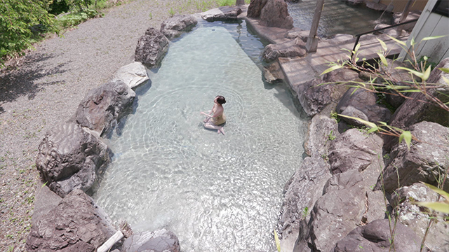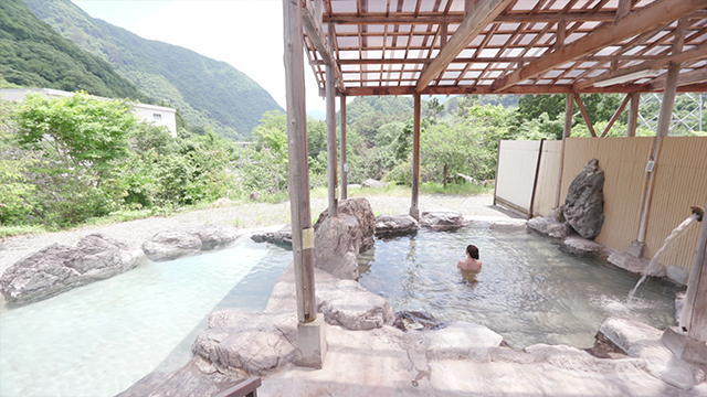鬼怒川で木材の運搬をしていた男性が掘り当てて、日帰り温泉を開業しました。源泉の温度はおよそ60度。湯船には42度前後で満たされ、ちょうどいい湯加減です。山深い風景をパノラマで楽しめる、気分爽快な湯船です。