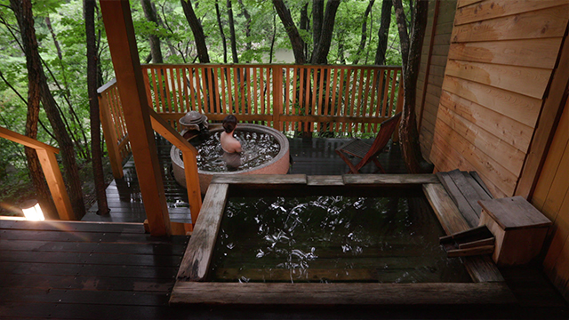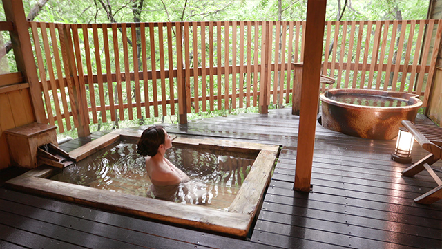 栃木を代表する鬼怒川温泉。温泉街から少し離れた森の中に、人気の温泉施設「あけび」があります。10棟ある湯小屋はすべて貸切制。