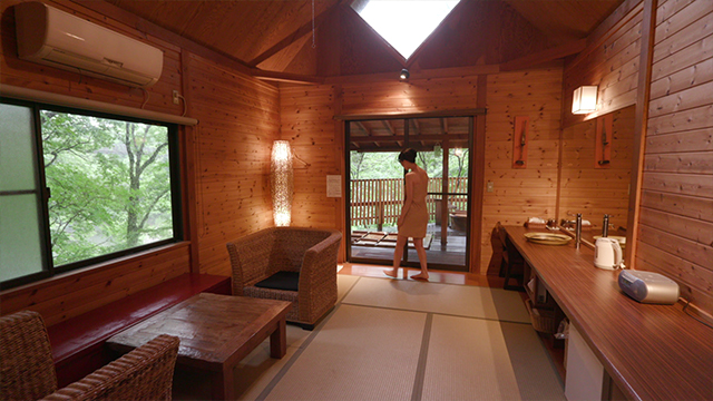 8畳ほどの畳部屋があり、その先に露天風呂が付いています。真下には鬼怒川が流れていて、渓谷にせり出すようにお風呂が設えられています。最長で10時間も借りられるので、お湯と自然をゆ~っくり独り占めできます。