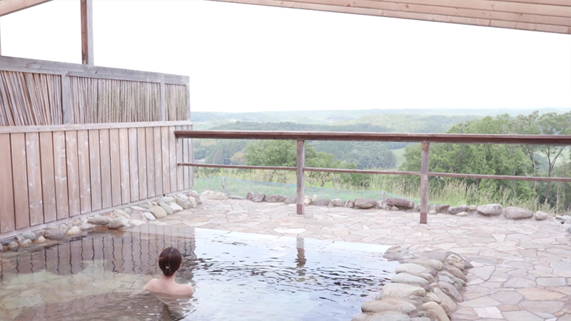 東北新幹線・那須塩原駅の東側、緑が広がる高台に、2020年にオープンした日帰り入浴施設・東山道那須温泉があります。那須高原や塩原方面を一望する開放的な露天風呂と内風呂があります。真ん中に大きな岩が据えられた湯船は、