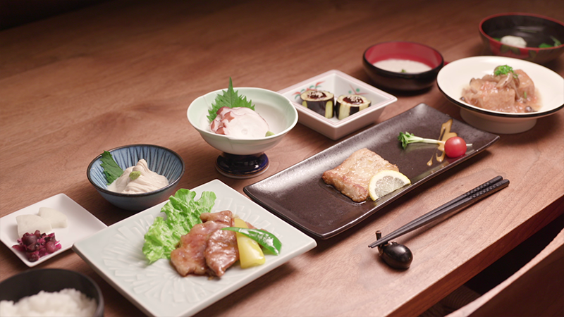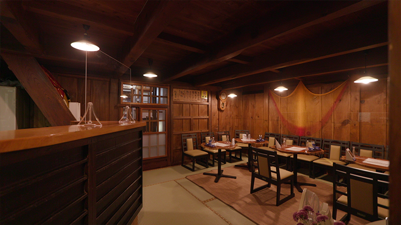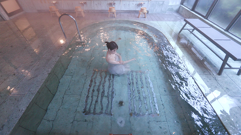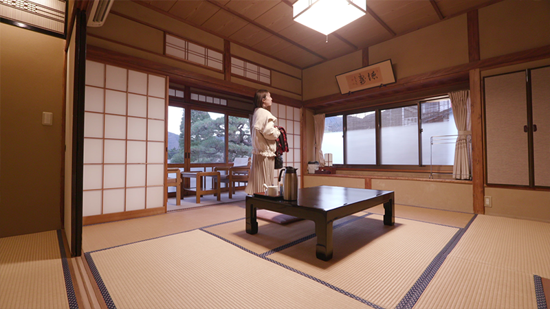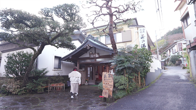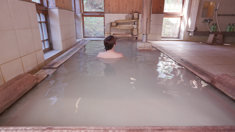 標高700m。強羅温泉は箱根山の山腹にあります。急こう配の坂が特徴的な温泉街で、坂の途中に立つ純和風旅館が今日の宿。太陽山荘です。15年前には国の登録有形文化財に指定され、耐震補強工事を経て、古めかしさと新しさが調和した宿になりました。玄関を出た先に、湯小屋があります。湯船には大涌谷から引かれた白濁のお湯が、かけ流しで使われています。よく見ると、細かい粒状の湯の花も。肌触りはとても滑らかで、じんわり体が温まります。夕食は食事処で、地元食材を活かし、肉も魚もバランスよく取り入れたメニューです。