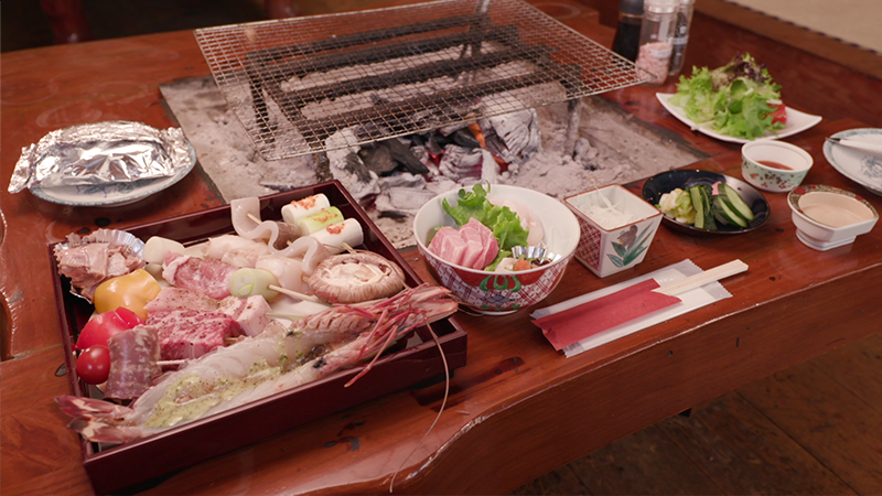 JR久留里線の上総亀山駅から車で10分。のどかな里山に、ポツンと1軒の宿が建っています。いろりの宿・七里川温泉です。名前のとおり、玄関のすぐ脇に豪快にしつらえた囲炉裏が出迎えます。部屋は全部で5室。内湯はタイル張りでお湯は、ぬめりがあり心地よい肌触りです。木造りの露天風呂からは、のどかな山の景色が望めます。夕食は、囲炉裏がある食事処で頂きます。焼き物には、エビ・イカ・ホタテ、豚肉、鶏肉、牛肉と勢ぞろい。その他、お刺身や酢の物など海と山の幸が味わえます。