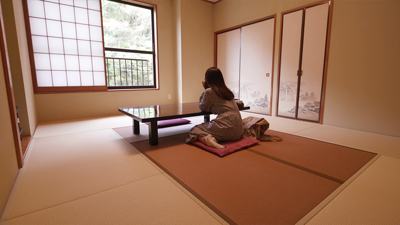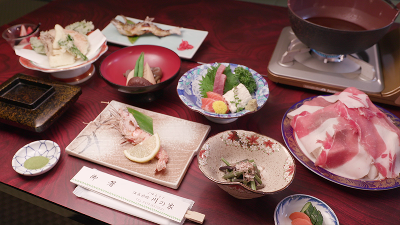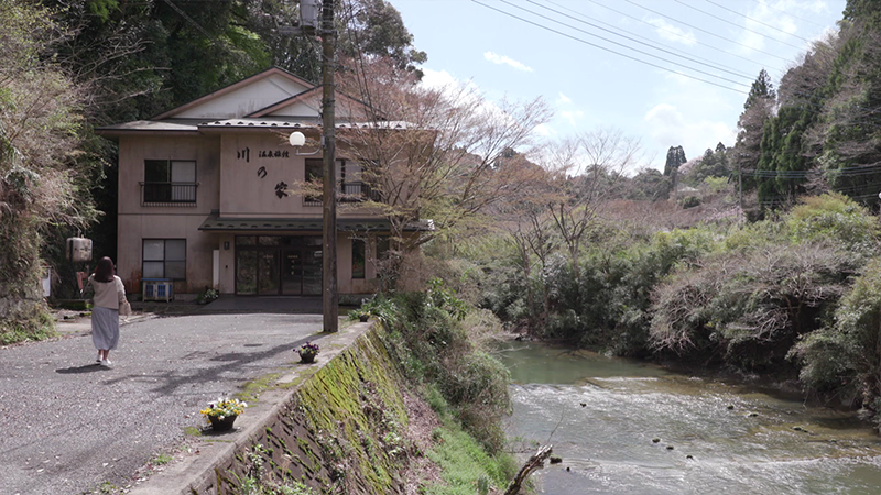 千葉屈指の名勝・養老渓谷から車で約10分。川沿いに宿があります。創業40年の川の家です。部屋は全部で7室。渓谷を見下ろす部屋もあります。内湯が2つあり、一日ごとに入れ替わります。湯舟は、まるで珈琲のように真っ黒なお湯で満たされており、ぬるぬるしていて心地よい肌触りです。夕食は、食事処でいただきます。養老渓谷のある大多喜町特産のタケノコやイノブタ肉の味噌鍋、ウナギのかば焼きなど山と川の幸が並びます。