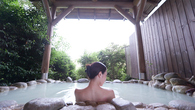 セラピーの後は、もう一度温泉に。貸切利用できる露天風呂の東側には、箱根の大文字を望むことができます。