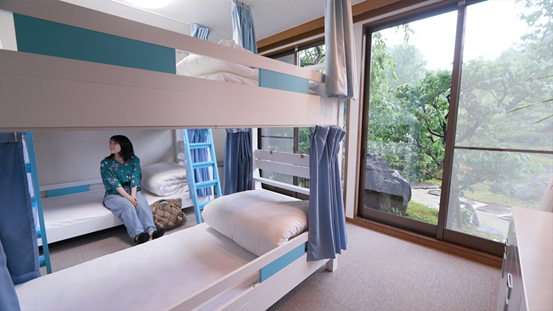 温泉街があったとされる場所から歩いて15分。木賀温泉「アサンテ・イン」。4名まで泊まれる和室のほか、低価格のドミトリータイプの部屋もあります。