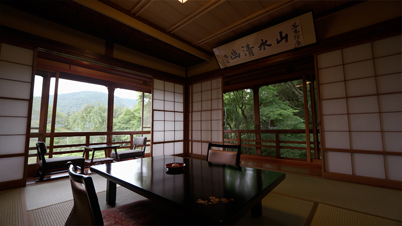 窓の外には、立派な日本庭園。箱根の山々を借景とした庭は、庭師でもある宿の主人自ら手がけたもの。大自然の景色を自由に想像しながら楽しんでほしい、そんな思いが込められています。