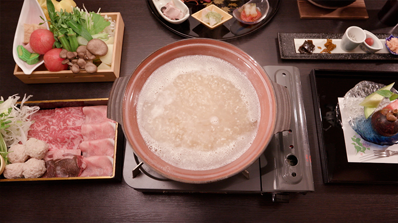 夕食のメインは、4種類の肉を味わう、宿名物の「甘酒鍋」。その昔、箱根の山を越える旅人たちが栄養補給に甘酒を好んだことにちなんで考えられたメニューだそうです。