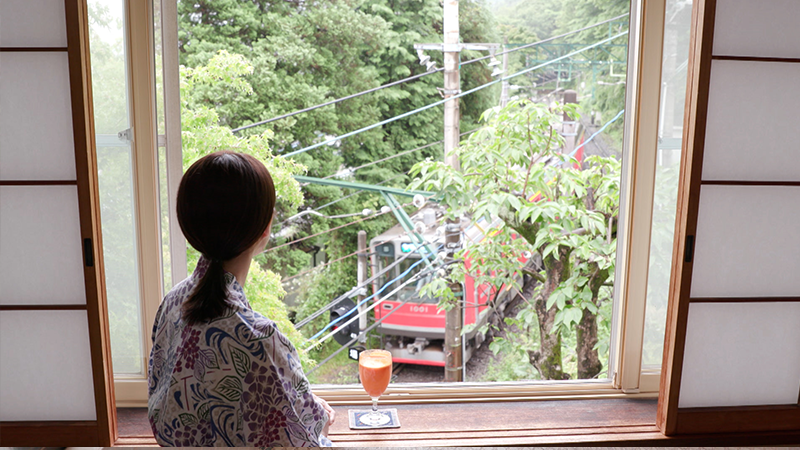 客室「福寿草」の窓からは、箱根登山電車が急こう配を克服するため行う「スイッチバック」の様子を眺めることができます。