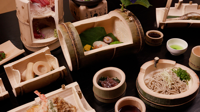 夕食の「かぐや姫プラン」は、ご主人が作った竹の器が並びます。「わさび蕎麦」は、北海道空知産のそば粉で打った十割蕎麦の麺に、わさびを練り込み、風味を付けています。