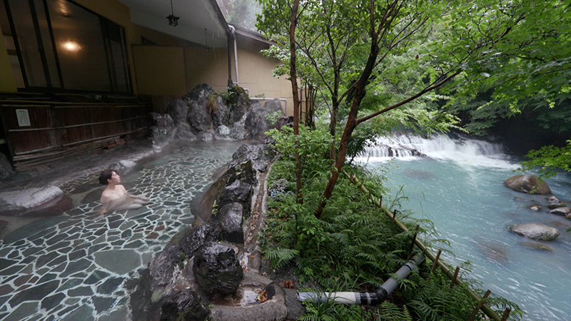薄い水色に染まった早川の渓流を眺める露天風呂。塔之沢温泉の開湯は、江戸初期と言われ、「子宝の湯」として知られる肌に優しいお湯です。