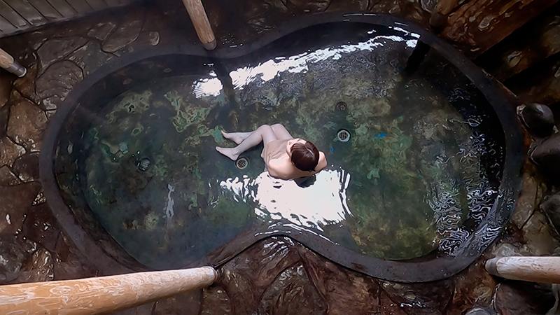 早川にかかる吊り橋を渡った先にある貸切風呂は、昔プールとして使用していた場所を改装した広々とした露天風呂。川のせせらぎと源泉が注ぎ込まれる音が心地よく聞こえます。