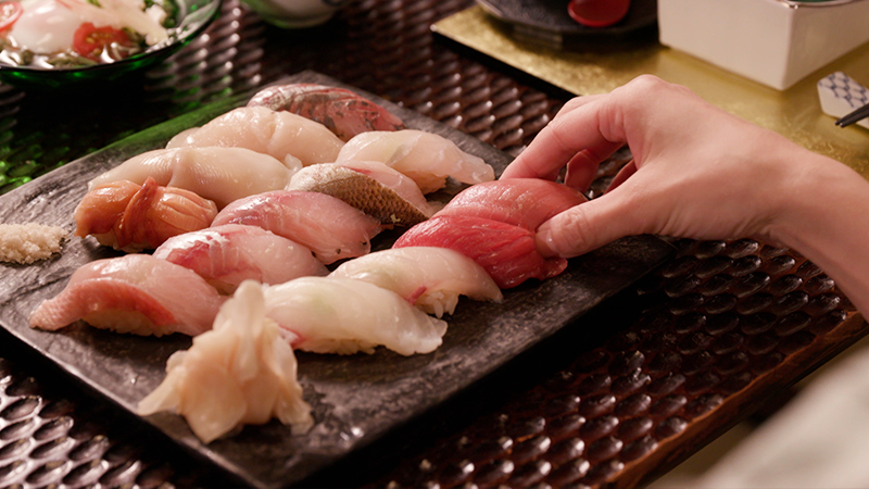 夕食には、部屋でお寿司を握ってくれるプランがあります。小田原の早川漁港で仕入れた新鮮なネタが並びます。