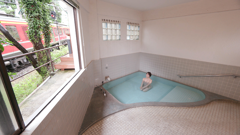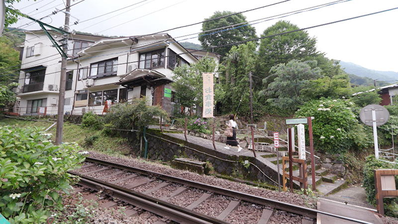 踏切の音が聞こえたら電車が通る合図。線路に挟まれたこの宿では、箱根名物の登山電車が、宿の周りをおよそ10分おきに通ります。