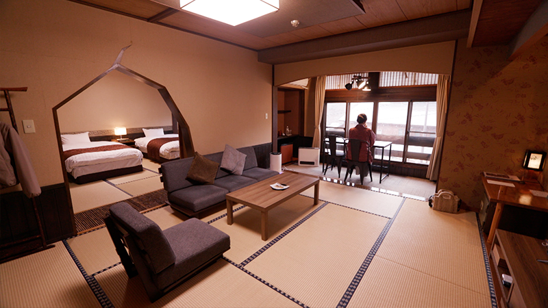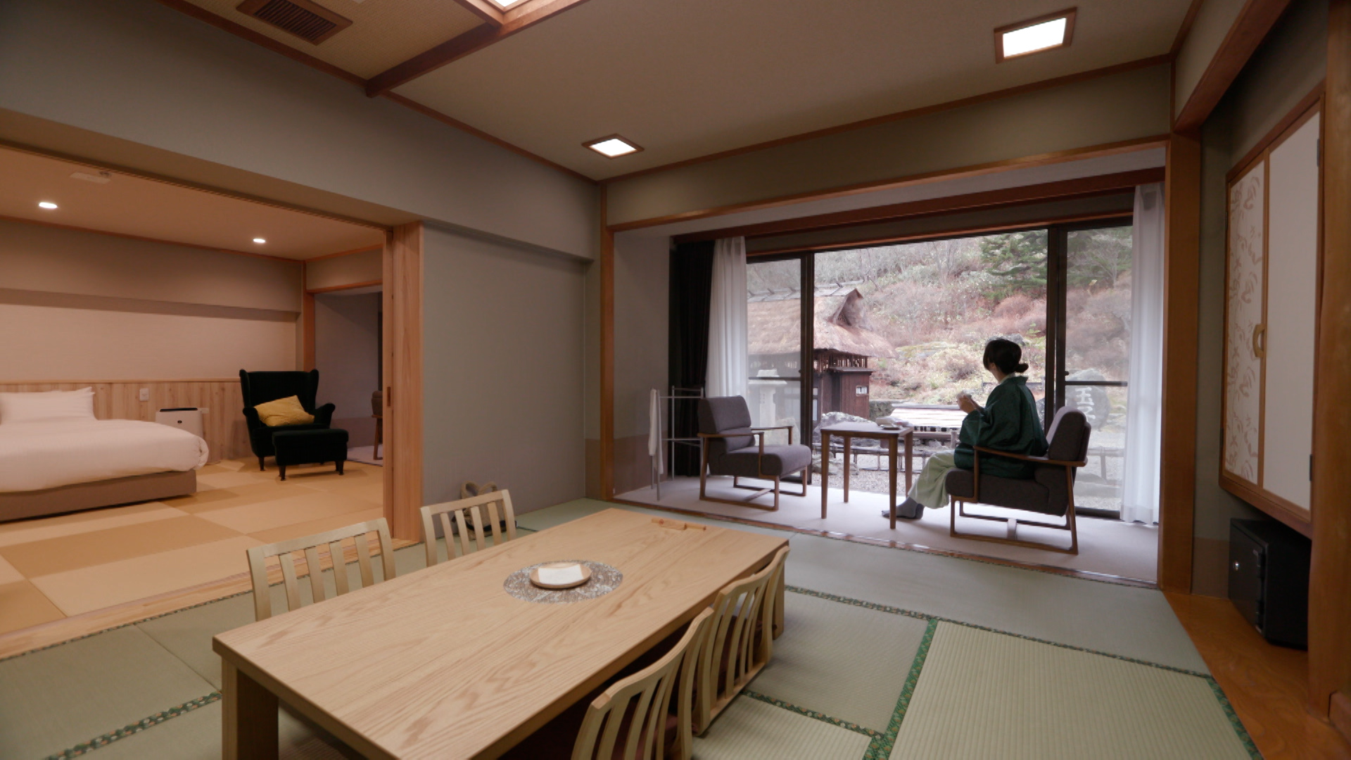 男女別の内湯、かつての湯治場の雰囲気を今に伝えています。昨年10月にオープンした特別室。 セミダブルベッドが2台置かれた二間続きの部屋です。