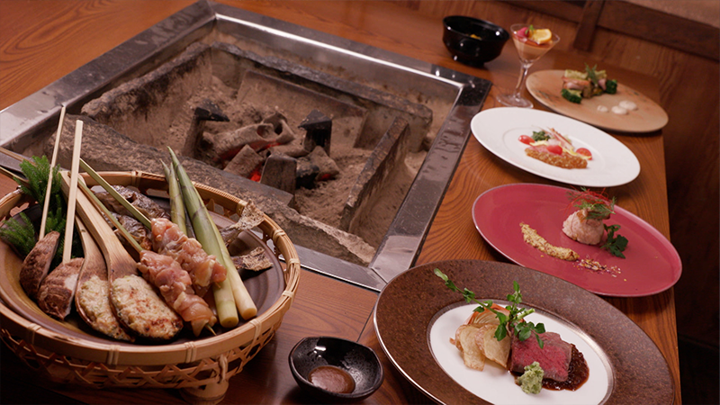 和風の囲炉裏焼きに加えて、ソムリエでもある料理長が作るコース料理も!