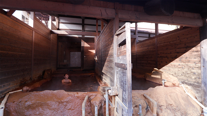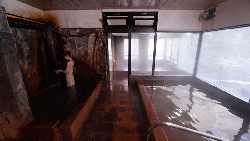 宿の開業は明治21年 ですが、それ以前の江戸時代の中頃にお湯が発見されたと言われ、近郊の農家の湯治場として親しまれていたそうです。男女別の内湯は、温泉成分に鉄が含まれるため、浴槽が茶褐色に染まっています。源泉は、浴室から15mほど離れた場所で自然湧出していて、傾斜を利用して浴室まで引かれています。源泉は24度ほどで、源泉がそのままかけ流されている湯船、少し加温して温めの36度に調整されている湯船、41度に調整されている湯船があり、3つの温度で茶褐色のお湯を楽しめる名湯です。