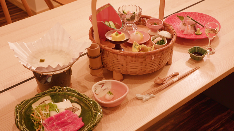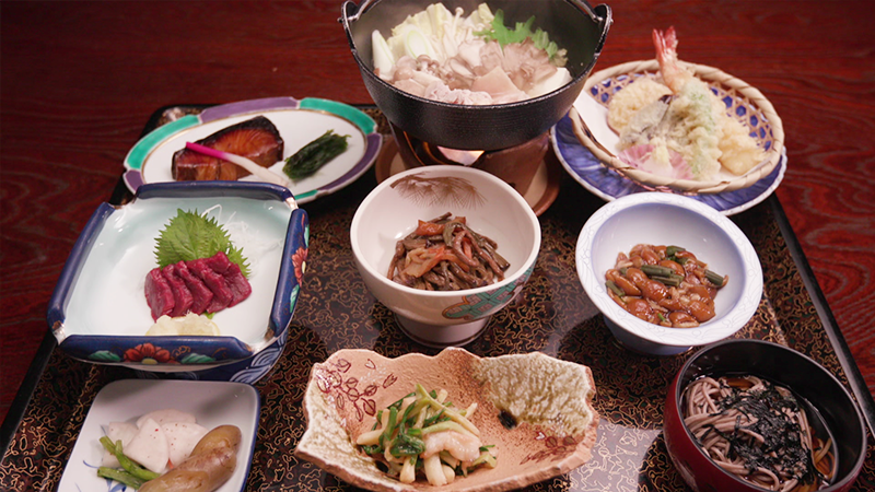 山形新幹線の停車駅、かみのやま温泉駅。上山市のまちなかに20数軒の宿や共同浴場があります。今日の宿は橋本屋です。客室は全16室。専用の露天風呂が付いた部屋もあります。内湯は広々としており、透き通ったお湯がかけ流されています。室町時代に開湯したと伝わるかみのやま温泉は、ナトリウム成分を多く含んでいます。温度も42度ほどで心地よく、とても柔らかい肌触りです。内湯の奥には露天風呂があります。大きな岩の湯船が目を引きます。蔵王山の大岩をくりぬいた豪快な湯船です。橋本屋の夕食は、広々とした個室で頂きます。食卓には、山と海の幸が揃います。