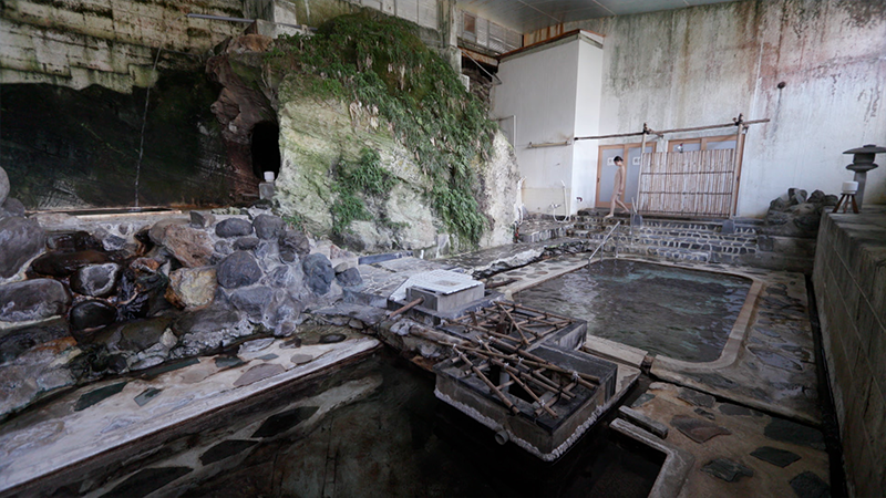 赤倉温泉「湯守の宿 三之亟」。宿の名物が野趣あふれる内湯「大岩風呂」。江戸時代に、当時の職人がお湯の湧く岩盤を手彫りでくり抜いて作ったそうです。「深湯」は43度ほどで、深さは3段階(60cm、1m、130cm)になっています。130cmの場所は立って全身が浸かることができます。「中湯」は季節などの条件によって異なりますが、この日、湯船の温度は58度。自然に湧いている温泉で、温度調整が難しいため、入浴できない日もあるそうです。階段を上がった先には、もう一つの湯船「高湯」があります。このお風呂は高い位置からお湯を落としています。空気に触れさせることで、お湯の温度を下げ、大岩風呂の中で、一番ぬるめの温度になっています。