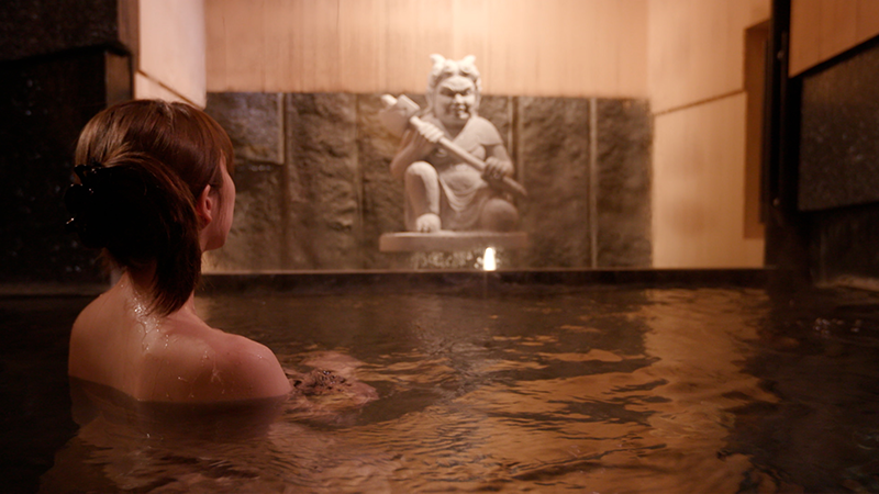 十数軒の宿が建つ洞川温泉。創業500年の老舗「花屋徳兵衛」に向かいました。洞川温泉の宿は、玄関の隣にある広い縁側が特徴です。夏、修験者が多く訪れると、この縁側を開放して、玄関の延長として利用するのだそうです。宿には「前鬼の湯」と名付けられたお風呂があります。その湯船には、透明なお湯が満たされています。泉質は、単純温泉。わずかにとろみがある、肌触りのいいお湯です。浴室に鎮座する一体の石像は、「前鬼」という鬼の姿をしています。その昔、大峯山を開いた役行者は、「前鬼」「後鬼」という夫婦の鬼を従えて修行をしたという伝説が残されているのです。もう一つの内湯には、前鬼と対を成すもう一体の鬼、「後鬼」の像がありました。夕食は、肉に魚、山の恵みが揃うメニューです。水がきれいな天川村で育てられたイワナのお刺身は、癖のない、さっぱりとした味わいです。メインは、自家製味噌を使った牛肉のホウバ焼き。ホウバの香りと甘辛い味噌が、食欲をかき立てます。修験道の里ならではの雰囲気に満ちた名所を堪能しました。
