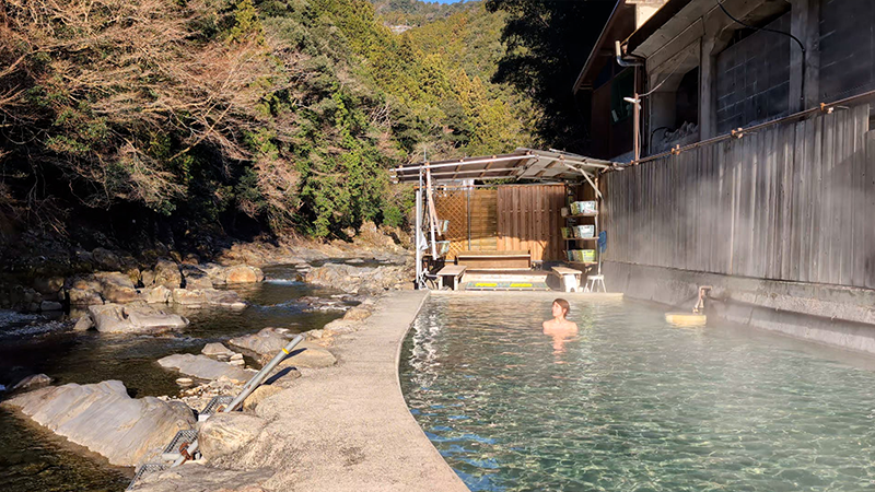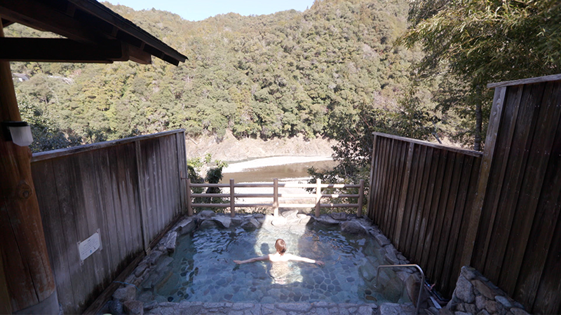 十津川温泉郷の名物、渓流沿いの大露天風呂。上湯温泉は硫黄成分を含み、心地よいぬめりがあります。神秘的で贅沢な時間を味わいました。