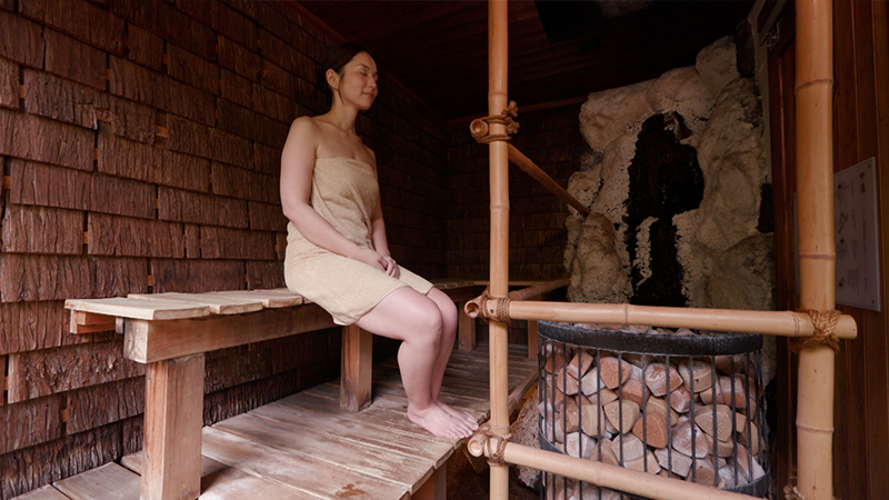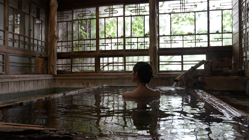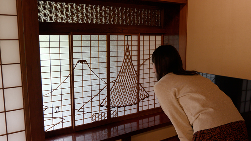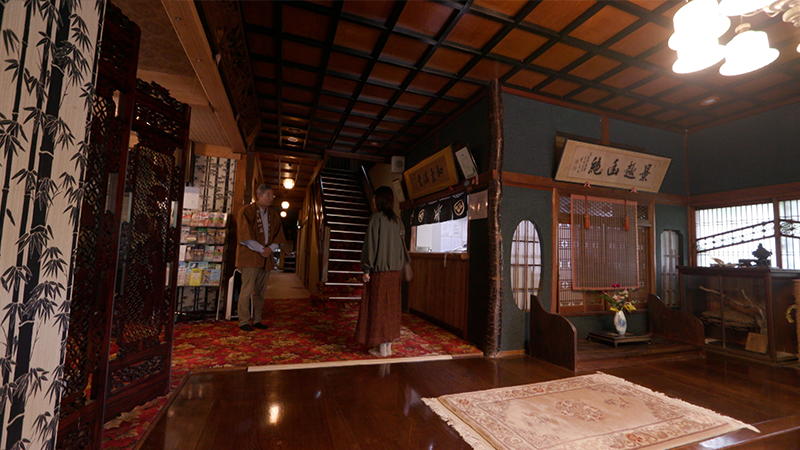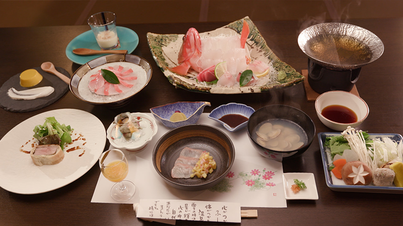 2本の川が合流する、川が落ち合う場所に立つことからその名が付いた「おちあいろう」。創業は明治7年。当時、近くに金山があり、金の採掘に訪れる要人をもてなすために建てたのが始まりです。7つの建物が国の有形文化財に登録されています。配膳係と宿泊客の動線が重ならないよう、互い違いに作られた階段。その天井には屋久島の屋久杉が使われており、木目がうずらの羽のように見えるそうです。廊下には大正ガラスが使われています。一見すると普通の透明なガラスですが、少し角度を変えると、微妙な歪みが。現在の製造方法ではこうした趣のガラスは作れないといいます。宿泊するのは、「露草」という部屋。障子には富士山と、魚を獲る網をかたどった組子細工。「投網」は金運と幸運を集めると言われ、「富士山」は子孫繁栄と商売繁盛の意味を持つ縁起のいいモチーフです。宿の名物「天狗の湯」へ。そこは岩肌が剥き出しになった洞窟風呂。洞窟をぬけると、開放的な露天風呂がありました。かつて、天城の天狗が、人目を忍んで訪れたという伝説から「天狗の湯」と名付けられたそうです。泉質はカルシウム・ナトリウムー硫酸塩温泉。無色透明のお湯は、さらさらとした感触で、湯冷めしにくいのが特徴です。併設されたサウナは、室内に温泉が流れ込む造りになっています。食事処でいただく夕食は、地元の食材を活かした会席料理。カラスミをふんだんに使った「そば」は、つなぎに地元、修善寺で育てた黒米を練り込んでいます。駿河湾で獲れた「あおりいか」は、まずは何もつけずに食べるのがおすすめ。歴史が息づく空間で、至福のひとときを過ごしました。