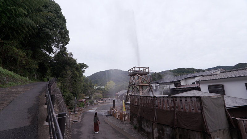 100度の温泉が約30mの高さまで吹き上がる自噴泉。大正15年に掘り当て、それ以来、沸き続けており、今は1日に7回みることができます。自噴泉の隣にある「花舞 竹の庄」に立ち寄りました。昭和8年に温泉宿として始まりましたが、今は素泊まりと日帰り温泉として営業しています。この宿の目玉は2階にある「大正檜風呂」。大正ロマンの風情を感じさせる風呂です。壁のタイルは市松模様。曇りガラスには手の込んだ意匠が施されています。隣の自噴泉の高さを利用して、源泉をそのまま2階に引き込んでいるそうです。泉質は「ナトリウムー塩化物温泉」。源泉は99度と熱いため、加水をして、40度ほどにしています。歴史ある名湯を堪能しました。