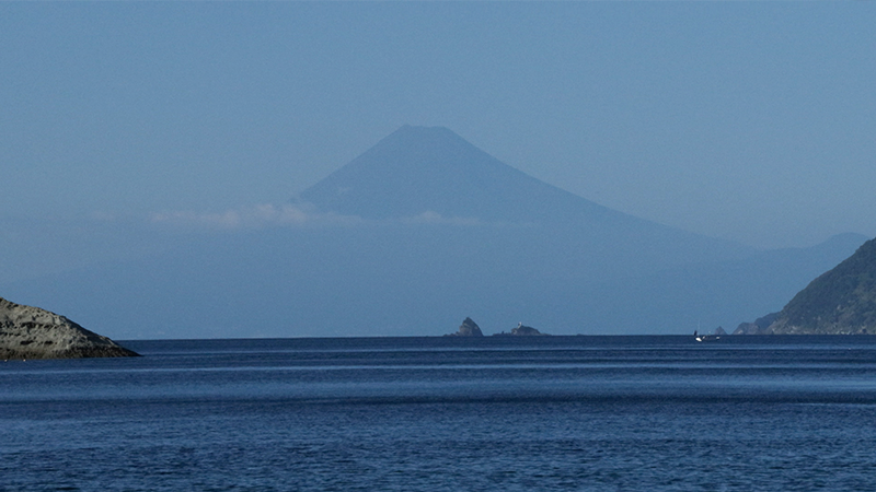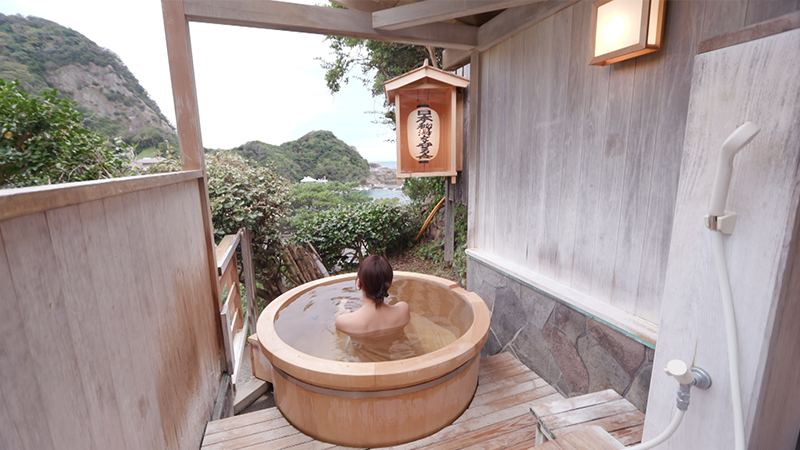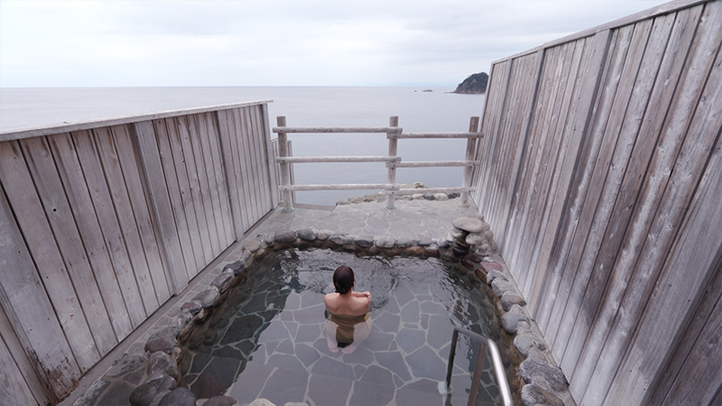 西伊豆の秘境、松崎町の雲見海岸。そこから見えたのは…まるで海に浮かんでいるかのような富士山。海岸の近くにあるのが、昭和37年に開業した「雲見園」。部屋は全部で5室。1日5組限定の小さな宿です。海が見える、貸切の小さな樽風呂。加水も加温もなしの源泉掛け流しで、泉質はカルシウム・ナトリウム塩化物泉。塩分濃度は海水の3分の1ほどあり、その濃さから「熱の湯」と呼ばれています。こちらの宿では毎分20リットルの源泉が注がれています。それを贅沢に味わうために宿泊客の数を少なくしています。夕食は食事処でいただきます。地元で獲れた新鮮な海の幸に、創作料理が並びます。駿河湾で獲れたアカハタのお造りや、金目鯛のしゃぶしゃぶ、分厚いマグロを地元松崎町の名産、桜の葉でくるんだパイ包み。夕食中に始まるのが、女将のトーク。小さな宿だからこそできる、おもてなし。翌朝、もうひとつの小さな岩の露天風呂へ。源泉の温もりと女将のおもてなしに、身も心も温まりました。