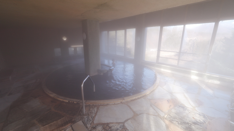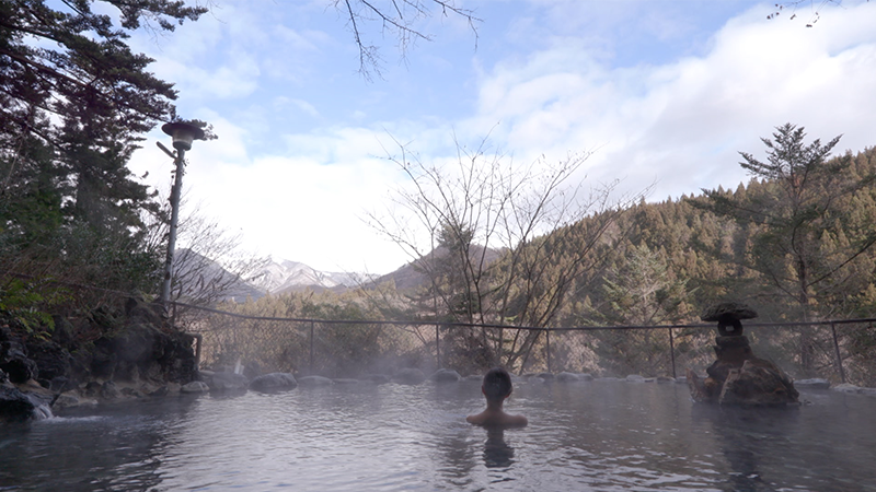1933年創業の猿ヶ京温泉「湯元 長生館」。宿名物の野天風呂は玄関を出て建物沿いへ…。約80段の階段を下った先にあります。野趣あふれる大きな野天風呂は、100㎡を超えるスケールです。源泉の温度が65度と高温なため、一度タンクに貯めて温度を下げてから湯船に注がれます。この日は41度前後、丁度いい湯加減でした。大自然の中で、その恵みである源泉を心ゆくまで堪能します。遠くに、新潟との県境にまたがる谷川連峰を望むことができます。客室は、すべて和室の30室。落ち着いた造りです。直径5メートルを超える丸い湯船。 中央の柱は小さな丸いタイルで装飾されており、昭和レトロを感じます。床面には、地元の須川石。湯気の中に浮かび上がる石の模様が、幻想的な雰囲気です。大自然の絶景と名湯の温もりに、心ゆくまで浸りました。