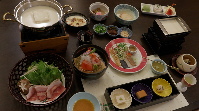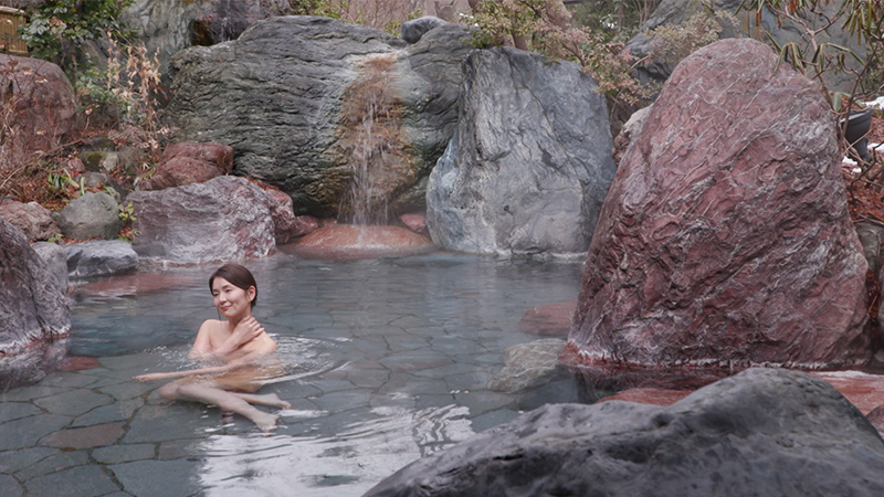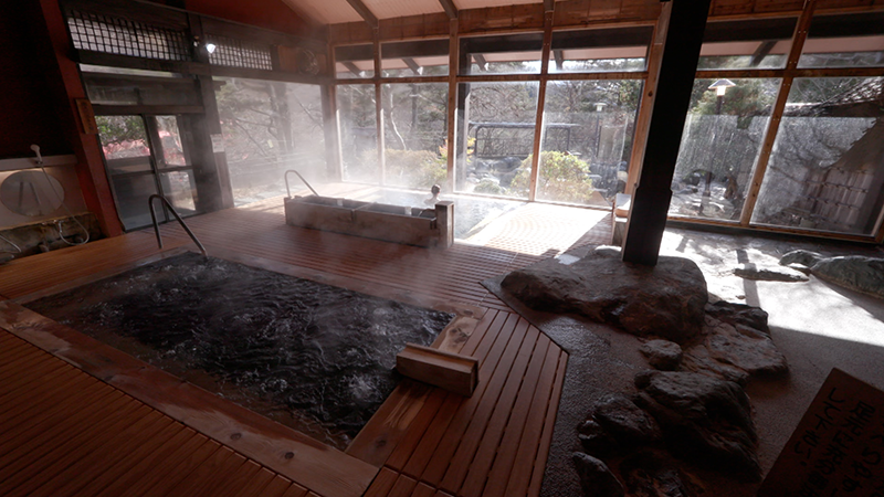 標高560mの赤谷湖。湖の畔に30数軒の宿が立ち並んでいるのが、猿ヶ京温泉です。 温泉街の東側に位置する「猿ヶ京ホテル」。52の客室がある大型旅館です。2つある大浴場のうちの1つ、「花の湯」は、手前のジェットバスと奥の湯船、共にヒノキで造られた4畳ほどのサイズです。大きな窓から、柔らかな陽の光が降り注ぎます。浴室の床は、滑りにくく冬場に素足で歩いても寒くないように、柔らかい素材になっています。お湯は、猿ヶ京ホテルと近隣2箇所の共同源泉で、宿では毎分150Lを利用しています。2つに仕切られた庭園風の岩風呂。左側は39度のぬる湯、右側には42度のお湯が満たされています。12.5畳と8畳の広々した二間続きの特別室は、4年前に温泉露天風呂つきの客室になりました。檜の湯船からは赤谷湖を望むことができます。食事処には、自家製の豆腐を使った料理が並びます。宿名物の「豆乳しゃぶしゃぶ」。群馬産の豚を自家製ゴマだれでいただきます。新鮮な豆乳でなければ出来ない湯葉は、自分で作るスタイル。赤谷湖のほとりの宿で、広々した大浴場と特別室のお風呂、2つのお湯を堪能しました。