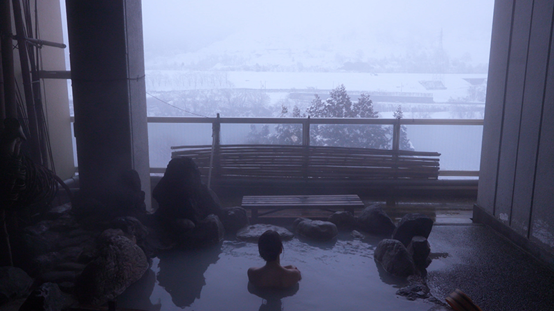 1959年創業の咲花温泉「阿賀のめぐみ 望川閣」。当初は木造2階建ての日帰り入浴施設でしたが、1991年に6階建ての温泉宿になりました。大浴場には3つの湯船があり、それぞれお湯の温度によって色が異なります。白濁の湯は37度ほどのぬるめ。少し濁りのあるエメラルドグリーンのお湯は、39度ほど。ほとんど透明な湯は、やや熱めの42度。実はこの3つの湯船、使っているお湯はみな同じ。源泉に含まれる金属イオンが、空気や温度に反応することで、お湯の色が変化するそうです。もともと大きなひとつの湯船でしたが、お湯の温度が安定せず、仕切りを設けることに。すると、湯船ごとに温度に違いが生まれ、3色に見えるようになりました。この3色の湯が評判を呼び、今では湯守が事前に温度を調整しているそうです。偶然が生んだ、不思議なお湯です。雪景色の阿賀野川を望む高台の露天風呂も、源泉かけ流しです。客室は全部で19室 。囲炉裏付きの部屋もあります。夕食には山の幸や海の幸をふんだんに使った料理が並びます。新潟の郷土料理「のっぺ」には、五泉市特産の里芋「帛乙女」が入っています。同じく「帛乙女」が使われている、里芋のベーコン巻きは、煮て柔らかくなった里芋に、ホワイトソースがよく合います。郷土の味に癒やされ、彩り豊かな名湯を阿賀の絶景とともに味わいました。