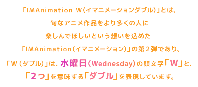 • 「IMAnimation W(イマニメーションダブル)」とは、旬なアニメ作品をより多くの人に楽しんでほしいという想いを込めた「IMAnimation(イマニメーション)」の第2弾であり、「W(ダブル)」は、水曜日(Wednesday)の頭文字「W」と、「2つ」を意味する「ダブル」を表現しています。 「IMAnimation W(イマニメーションダブル)」とは、旬なアニメ作品をより多くの人に楽しんでほしいという想いを込めた「IMAnimation(イマニメーション)」の第2弾であり、「W(ダブル)」は、水曜日(Wednesday)の頭文字「W」と、「2つ」を意味する「ダブル」を表現しています。