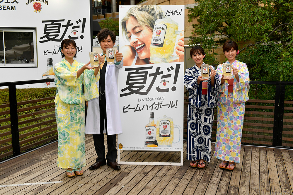 最後は『水上ハイボールフェス presented by JIM BEAM』の開催と、『遺留捜査』 のスタートを祝って、司会の山本雪乃、宇賀なつみ両アナウンサーと共に『MEGAビームハイボール』で乾杯!