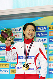 800m自由形で銀メダルを獲得し、柴田亜衣選手とワン・ツーフィニッシュを成し遂げたのが、矢野友理江選手!大会2日目、得意の200mバタフライで、フライングで失格となり、相当なショックを受けたはずです。そんな中で、気持ちを切り替えて、頑張りました。200m個人メドレーでも、高桑健選手が、粘りの泳ぎを見せて、見事、銅メダルを獲得!