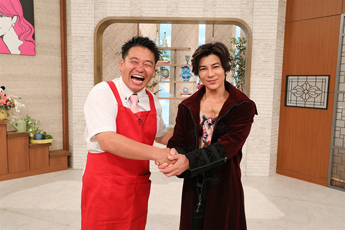 しかも、そのいでたちはというと…真っ昼間の通販コーナーにはまぶしすぎるド派手タンクトップに革パン、物々しいロングコート! 実はこの格好はほかでもない、武田が『復活スペシャル』で演じる“71歳にして40代の肉体を持つ美魔女の男性版”=美魔王藤原のものなのです。というのも今回はなんと、武田が“美魔王藤原”になりきって『ものコンシェルジュ』に乱入! 劇中で“通販業界のカリスマ”として大活躍する美魔王が、本物の通販コーナーでもその手腕を発揮します。