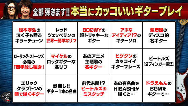 GLAYのHISASHI、TRICERATOPSの和田唱という、凄腕ギタリストのお二人をゲストに招き、事前アンケートで挙げてもらった「本当にカッコイイ!!」と思うギタープレイの中から、関ジャニ∞とサバンナ高橋さんがリクエスト!それを“全部弾いて解説してもらう”という贅沢なリモート企画!