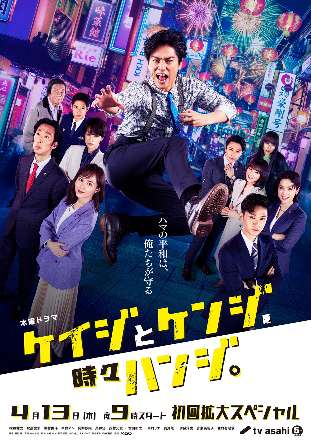 放送スタートに向け、日々熱量を上げている新ドラマ『ケイジとケンジ、時々ハンジ。』が、4月13日(木)に初回拡大スペシャルで堂々と幕開けることが決定。と同時に、ついにポスタービジュアルも完成しました! 華やかなヨコハマの街を背景に勢いよく飛びあがる桐谷健太(仲井戸豪太・役)。その周りには先日発表された比嘉愛未(仲井戸みなみ・役)、磯村勇斗(目黒元気・役)、中村アン(矢部律子・役)、吉瀬美智子(諸星美沙子・役)、北村有起哉(二階堂俊介・役)に加え…本日解禁となったキャストも勢ぞろい! なんと岡崎紗絵、長井短、西村元貴、古田新太、伊藤淳史が個性豊かなキャラに扮し、大人の群像劇をガンガン盛り上げます。