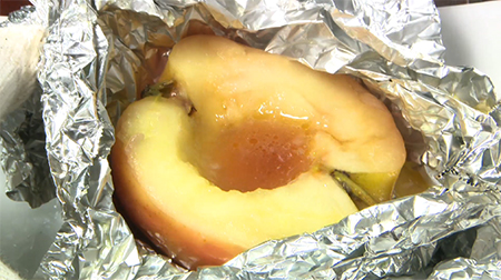 半分に切ったりんごの芯をスポーなどでくり抜き、そこに砂糖をたっぷりと入れる。さらにバターを適量加えたら、アルミホイルで2重に包みます。そして、それを直火で焼くだけ。炭の中に放っておくこと15分。りんごの焼けるいい香りがしてきたら完成!