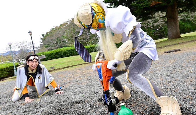 マブシーナが目を覚ますと、手には泥で汚れたシャイニーブレイカーと宝路(庄司浩平)の手帳が。作戦室のテーブルは破壊され、博多南(古坂大魔王)も負傷していた。日本茶を飲んだマブシーナが大暴れしたからだったが、マブシーナは覚えていない。クリスタリアにはメロロフモフモというお茶と同じ原料の飲み物があり、それを飲むと酔っぱらうのと同じ状態になるのだ。酔っぱらったマブシーナは4つ目のカナエマストーンを探すと飛び出し、それを追って出て行った宝路とは連絡が取れなくなってしまっていた。