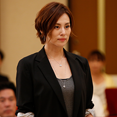 体のシルエットをきれいに見せるコーディネート。裾がフリンジになったスカートからは、脚がちらちらと見えるのもきれいです。法廷シーンなので、グレートーンでびしっと感も意識して。