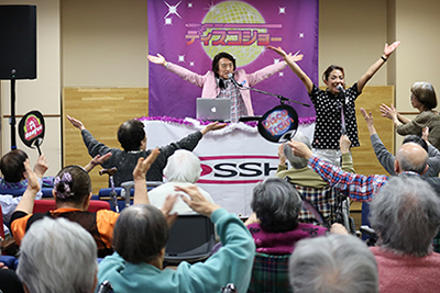 2019年度より開始して大人気。ディスコDJのDJ OSSHY(ディージェー オッシー)さんを高齢者施設にお連れして、懐かしのディスコ曲に合わせて身体を動かし、楽しいひと時を過ごしてもらう「DJ OSSHYディスコショー」も企画しています。