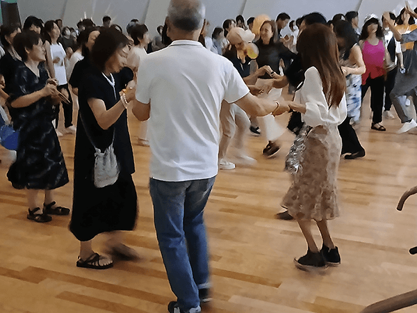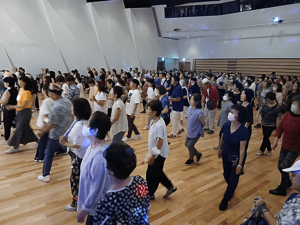 80歳代の参加者もいらっしゃり、皆さん真剣な表情で足を前後左右に動かしながら、一生懸命ステップを練習していました。