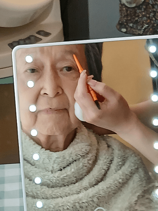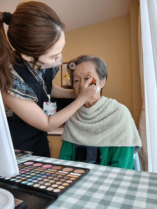 昔、銀座の百貨店で縫製のお仕事をされていた方は、普段からご自身で前髪を整えるなど、おしゃれにとても関心をお持ちです。ケアメイクの際も、「この色がいい!」と積極的に色を選ばれていました。