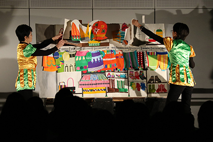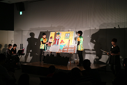 中井貴惠with大人と子供のための読み聞かせの会による「絵本の世界へようこそ」は中井さんが朗読して、荒井素子さんが作曲し高橋真理子さんとともにピアノ演奏されるオリジナル音楽と、平野知代子さんと宗佳代子さんが手作りして操作する大きな仕掛け絵本(パネルシアター)が合わさって、とても魅力的な絵本の世界を作り出す公演です。結成以来この20年、小学校や幼稚園、小児病棟などで今までに1300回以上の公演を積み重ねてきただけあり、息もぴったりです。会場のみんなが絵本の世界に入りこみ、軽快な音楽とともにお話は進んでいきました。あっという間の約1時間の公演が終了すると大きな拍手の音が響きました。