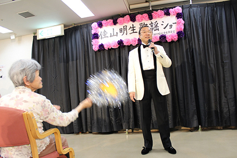 7月10日、稲城市の特別養護老人ホーム「いなぎ苑」に、佳山明生さんをお連れして歌謡ショーを行いました。併設のデイサービスの方々が開演の1時間も前から前列の席を埋め尽くし、佳山さんのショーを心待ちにされていました。会場のBGMとして流れる佳山さんの歌うカバーソングに合わせて、開演が待ちきれない方々の口ずさむ歌が廊下まで聞こえてきます。その後も続々と利用者が集まり、開演の時間には会場は溢れんばかりの150人の大盛況となりました。