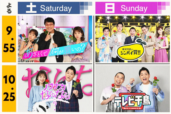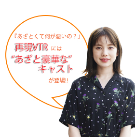 - ■ココに注目!■ 『あざとくて何が悪いの?』:皆さんが胸の中で思ってモヤモヤしている事を、私達が好き勝手言うところが見どころです!番組を見て、「あるある〜!」と共感してもらえたらいいなと思います。放送は土曜日という事で、この番組を見てスカッとして、また月曜日から楽しく社会生活を送れる…そんな番組になればいいな、と思っています♪ 『ノブナカなんなん?』:何よりもノブさんのツッコミが光る番組です!一見、「なんなん?」と思ってしまう人でも、VTRでどういう生活をしてらっしゃるのかを見ていると、自然に感情移入して応援したくなるんです。スタジオでは、ノブさんとツッコミながらVTRを見ています。皆さんもテレビの前で、スタジオメンバーになった気分で、声に出してツッコミながら一緒に楽しんでいただきたいな、と思います! |