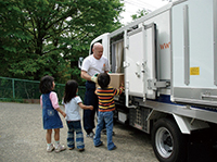 家庭やスーパーなど、区内約9000ヶ所から使用済みの食品トレーを回収し、発泡スチロールを再資源化します。レーの収集は区が、再資源化を地球船クラブが行う事業で、知的障害者の雇用とリサイクルを結びつけた全国初の取り組みとして注目されています。