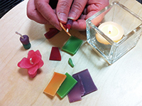 いろんな色のミツロウ粘土を手でこねて、芯に巻き付けたり、好きな形を作って穴をあけて、芯を通したり・・。形も大きさも自由なオリジナルキャンドルを作ります!